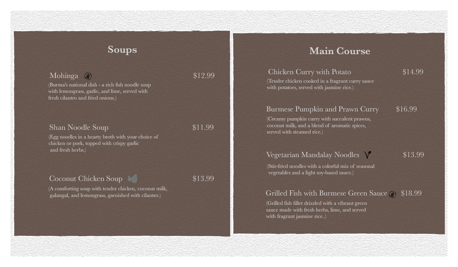 A Mosaic of Authentic Burmese Flavors, a True Celebration of Heritage and Culinary Craftsmanship. Named after region to convey Flavor, Culture and tradition.